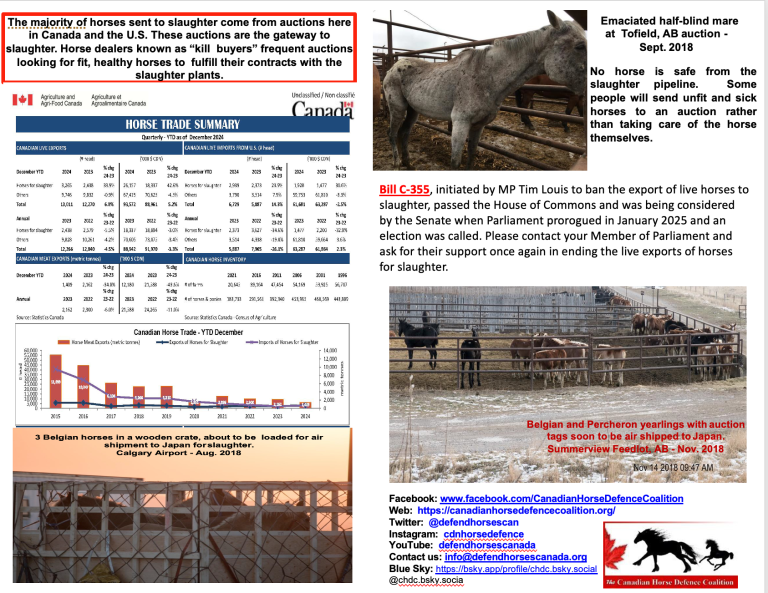 Auctions are the gateway to slaughter.  Kill buyers attend low end auctions and pay for horses by the pound to fulfill their contracts with the Bouvry slaughterhouse in Fort MacLeod Alberta.  This flyer contains information on ways of keeping your horse from going to auction.