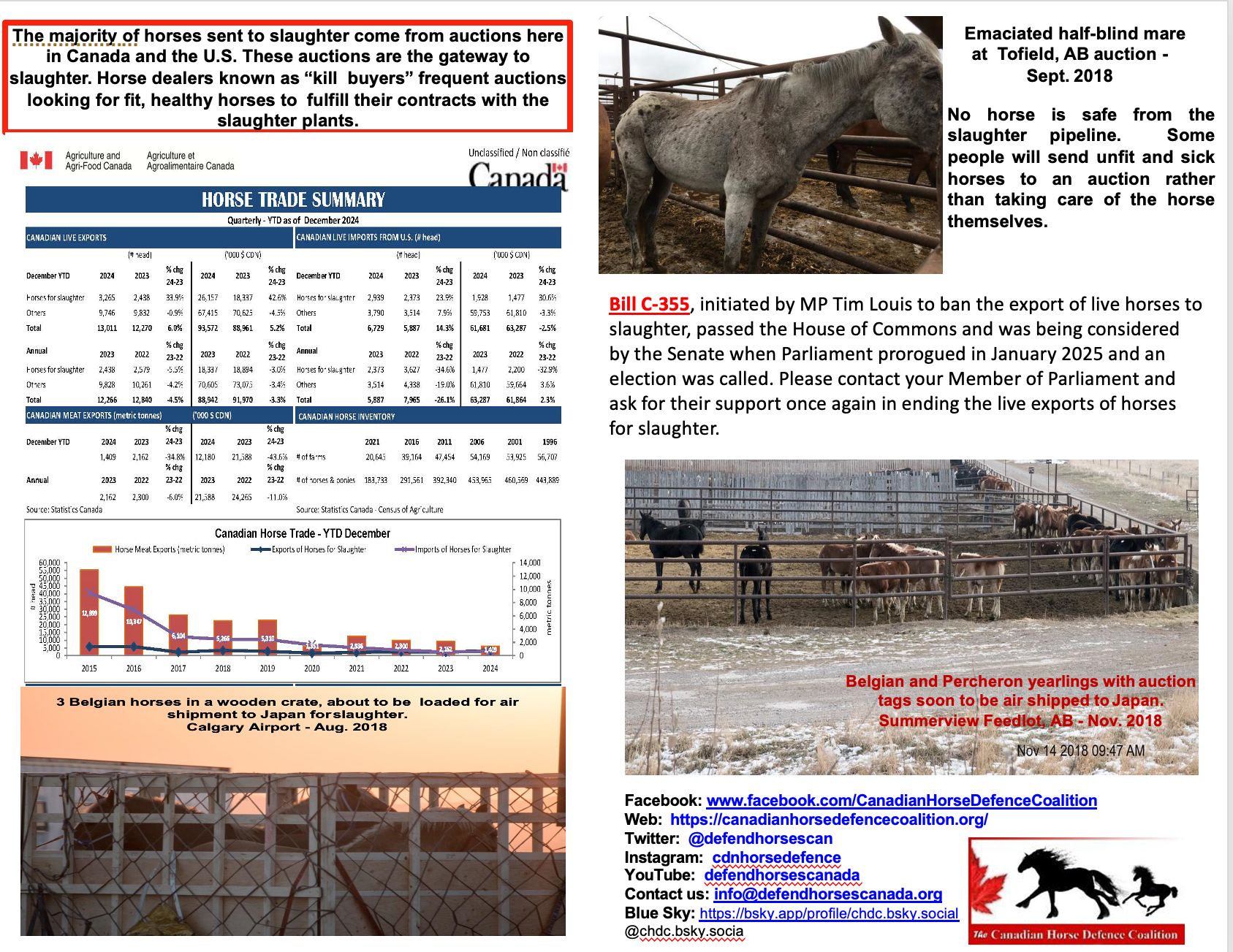 The most recent horse slaughter statistics will be posted on our STATS page as they become available. For more information about horse slaughter in Canada, please visit the New to Horse Slaughter page on our website.